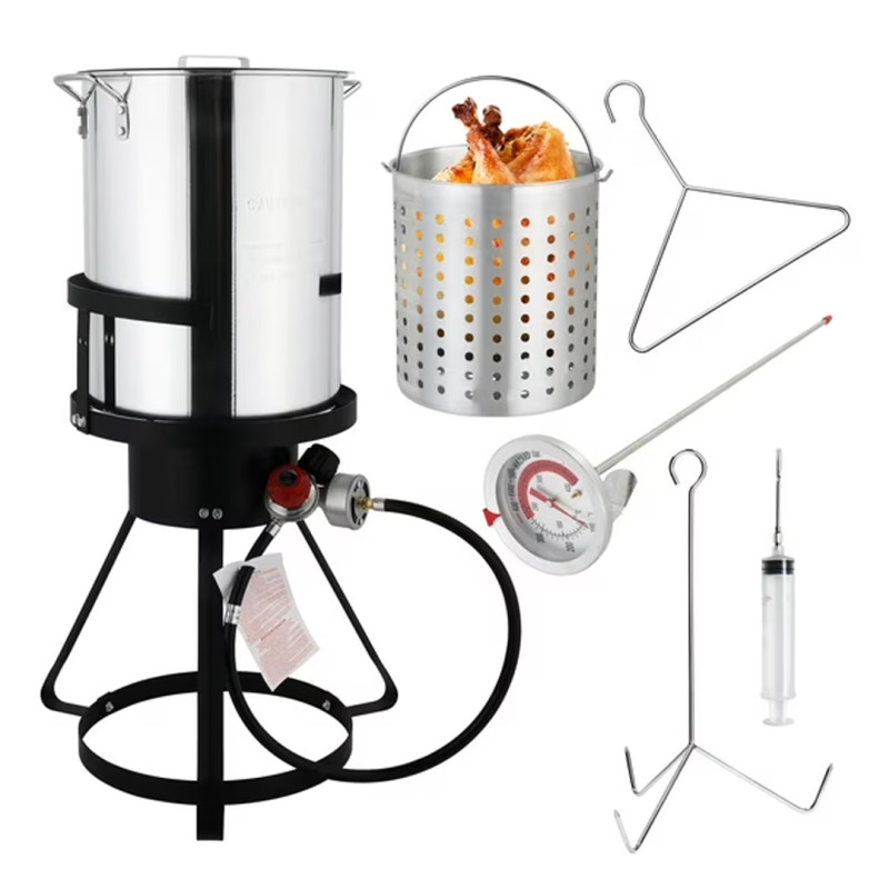 - Includes: Stand, pot, fryer basket, fuel hose, injector, thermometer, lifting handles