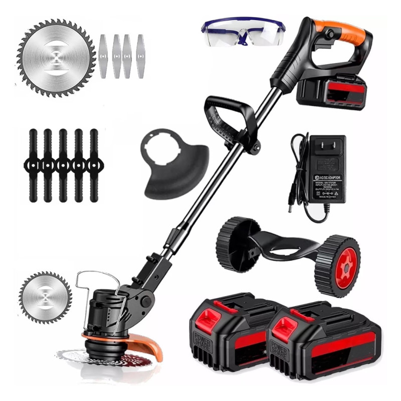 Functionally, this device is for light weeding, use as an edger, and for shaping small brush. The kit includes plastic, steel, and saw blades for grass, pruning, and small branches, respectively. There’s also the ability to add wheels and a blade guard to the bottom to convert this into a cross between a lawn mower and a string trimmer (no string included). Finally, the kit includes batteries, a charger, and even safety goggles.